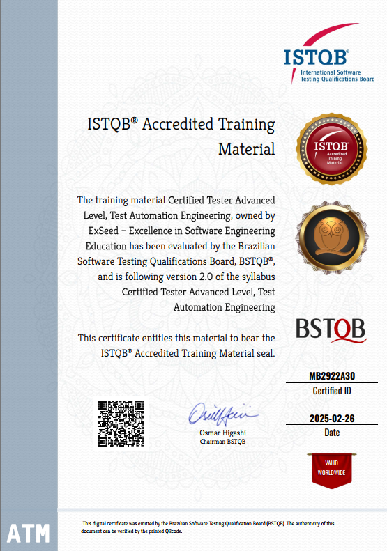 O material do curso CTAL-TAE 2.0 é credenciado, garantindo total alinhamento com as exigências estabelecidas pelo ISTQB / BSTQB.